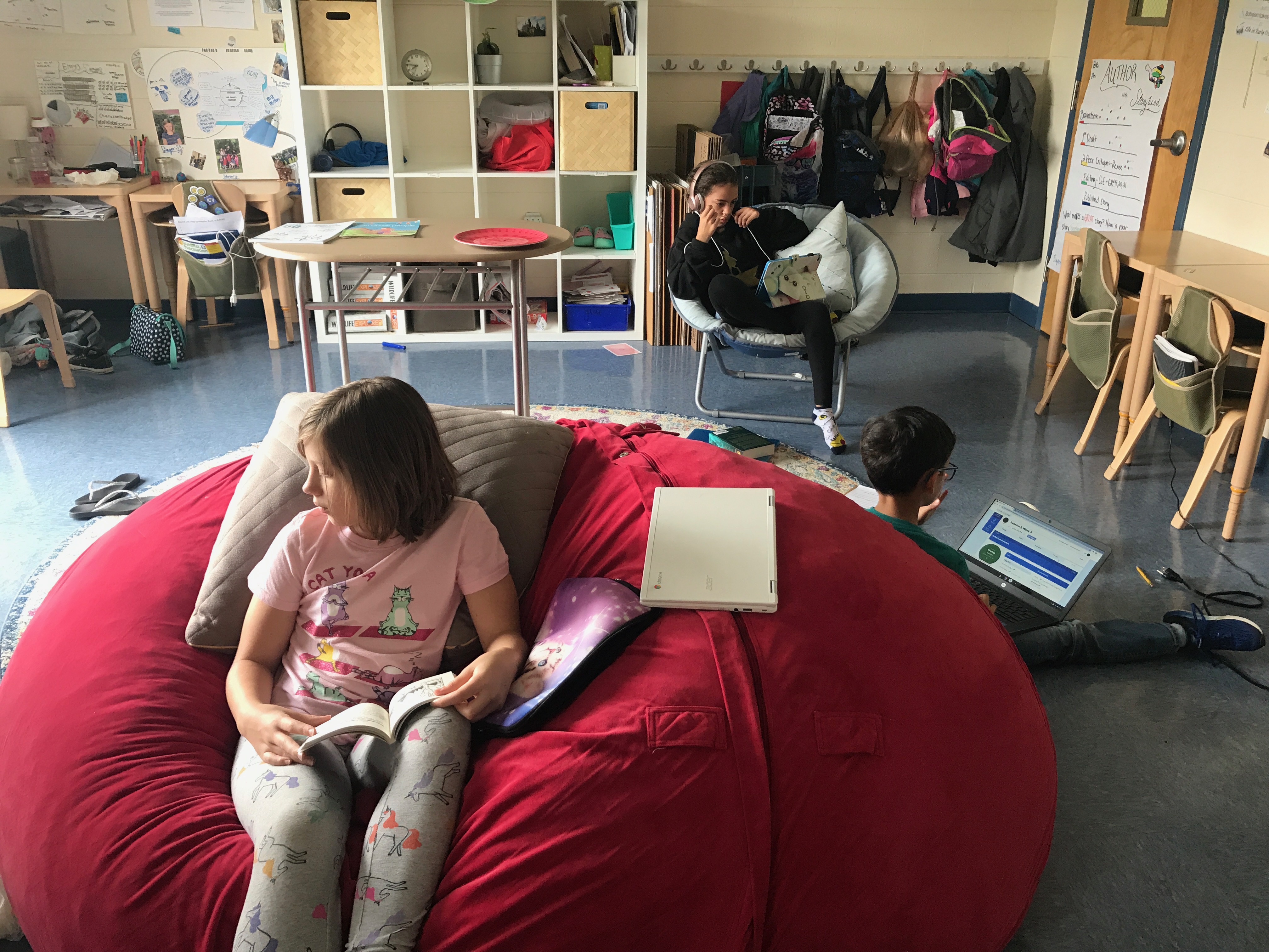 10:45 After a quick brain break, “class” begins! 2 Heroes are reading- one with an audio book and another with a chapter book. Another Hero looks at his work plan and decides what to work on next. Below, 3 different lessons are happening- Level 1 Spelling, Level 2 Spelling, and Level 1 Math. This is an example of our individualized learning in action!