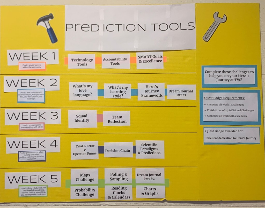The Heroes started their first quest, The Prediction Tools Quest, which explores the question, “Can you determine your future? What actions will increase your success?” This Quest introduces the Heroes to the many tools available to them in their self-directed learning environment, including Freedom Levels, safe usage of Technology, and Town Meeting for community problem-solving.
