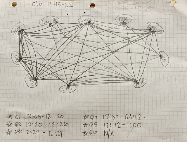 Civilizations is a learning experience that provides a rich space for learners to grow in all of the skills noted above. During Civilizations learners engage in quality research about a specific topic, create original arguments, think critically about historical events and figures, and listen to each other through socratic discussions. Each Civilization experience creates another web of connections for learners to consider their role as individual learners and as members of the team. Did I engage with everyone, with whom the most, and who engaged with me? How much or how little did I contribute? Whose perspective made me reconsider my own? How did my thinking change as a result of the discussion?