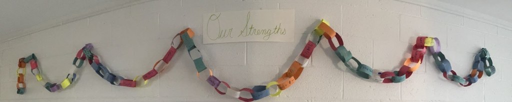 In addition to identifying our emotions, becoming more self-aware means that we can recognize when change is necessary in our lives and discover ways we can progress towards change. This skill requires a person to be able to identify their strengths. In Discovery studio, we took time to reflect on our strengths, what each of us brings to our community that makes us feel connected to each other. Then, we built a strengths chain together. This project was full of excitement, hard work, and determination. The learners enthusiastically wrote down all the qualities they were proud of and helped each other build our chain. The chain hangs in our hallway so each of the learners can remember that they each have important qualities that they bring to create a thriving learning environment.