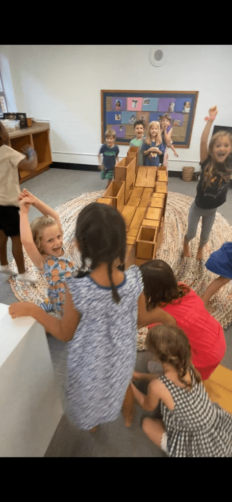 Aaand, they’re off! For their second week of school, Spark learners took on their first big group challenge. After a week and a half of routine-setting and practicing procedures, they were ready to let loose and build something cool together. They explored their new big, heavy blocks, learned how to use them safely in the studio, then got to work.