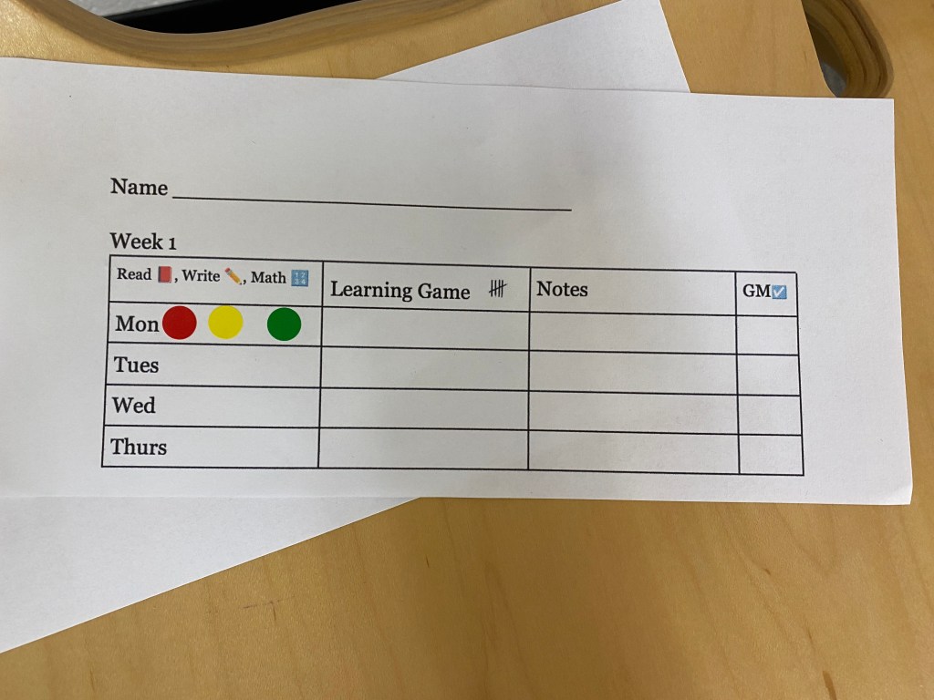 In that first column, learners add stickers for reading (red), writing (yellow) and math (green) as they complete them during morning work. There is also a column for the “Learning Game,” which is explained in more detail below, a notes section, and a place where they can record their guide meeting for the week.