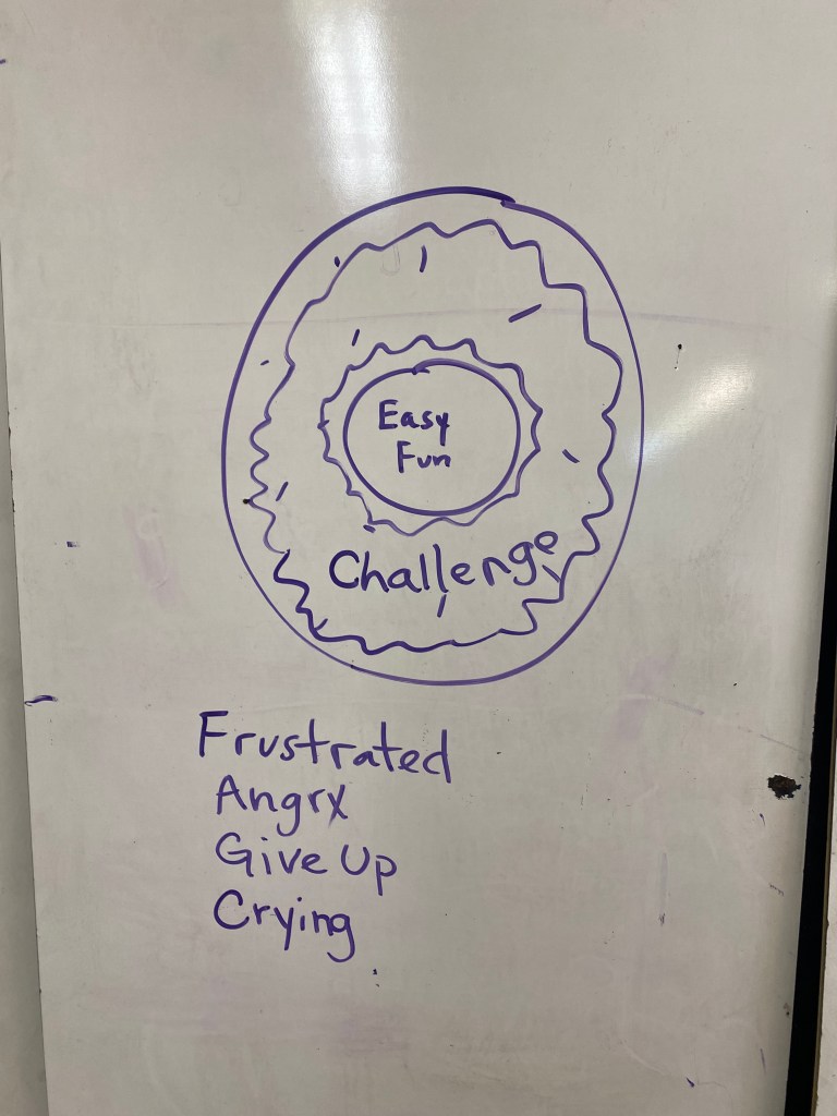 As a side note, we talk a lot in all the studios about doing challenging work. Work that is not too easy, not too hard, but just right. We visualize this in Spark with the ‘challenge doughnut’ above. We also tell a story about Goldilocks visiting Spark studio. (I wonder if they can recount this for you at bedtime this weekend?) The goal is to help learners find and stay in their challenge zone, a skill that will help them in the Discovery studio and beyond.