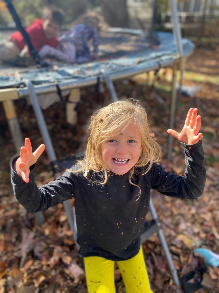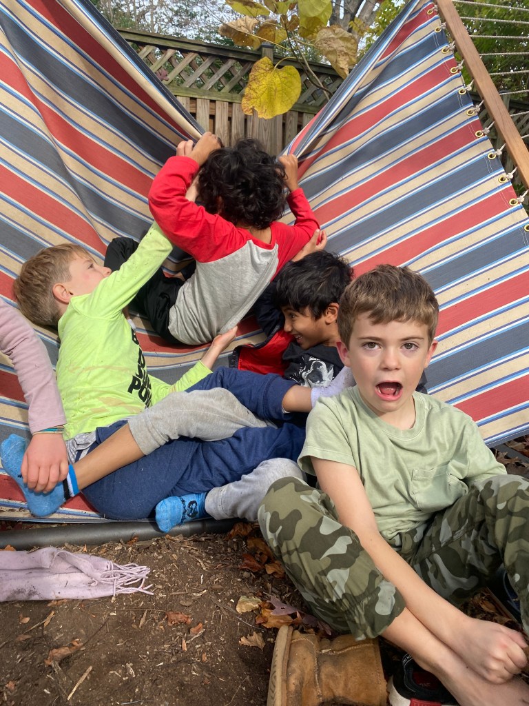 Other groups collect sticks for the afternoon fire, assemble “soup” ingredients, or swing on the hammock strung between two hundred year-old trees. In the autumn, oak leaves blanket the lawn, just waiting to be raked into piles. It’s amazing how much organization this takes, inspiring even the little ones to step up and lead. They all take turns leaping in and burying each other.