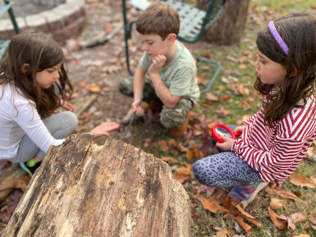 Some learners waste no time in turning over the giant logs surrounding the fire pit or rocks outlining the gardens. After having laid undisturbed for a week, these spots teem with new critters. Finding a stag beetle or two is all but guaranteed year-round, but the children marvel when they unearth the occasional centipede or spot a woodpecker. Last week, they found a salamander guarding its tiny, translucent eggs.
